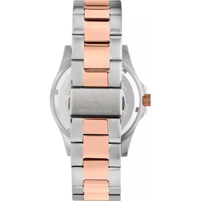 Diese Maserati Uhr hat ein Edelstahl Gehäuse mit einem Durchmesser von 43 mm und ist mit einem Armband aus Edelstahl versehen. In der Uhr arbeitet ein Seiko Instruments Inc. Uhrwerk. Das Glas der Uhr besteht aus Sapphir - Glas.