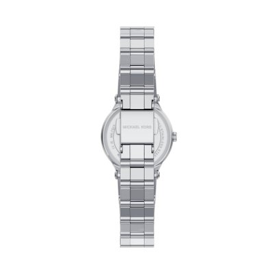 Diese Michael Kors Uhr hat ein Edelstahl Gehäuse mit einem Durchmesser von 26 mm und ist mit einem Armband aus Edelstahl versehen. In der Uhr arbeitet ein Miyota Uhrwerk. Das Glas der Uhr besteht aus Mineral - Glas.