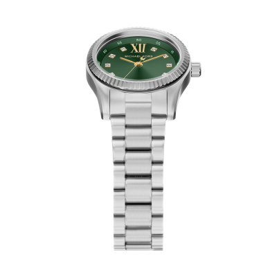 Diese Michael Kors Uhr hat ein Edelstahl Gehäuse mit einem Durchmesser von 26 mm und ist mit einem Armband aus Edelstahl versehen. In der Uhr arbeitet ein Seiko Instruments Inc. Uhrwerk. Das Glas der Uhr besteht aus Mineral - Glas.