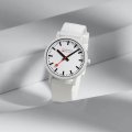 Diese Mondaine Uhr hat ein Kunststoff / Harz Gehäuse mit einem Durchmesser von 41 mm und ist mit einem Armband aus Textil versehen. In der Uhr arbeitet ein Ronda Uhrwerk. Das Glas der Uhr besteht aus Gehärtetem Mineral - Glas.