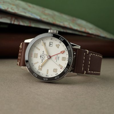 Diese Mondia Uhr hat ein Edelstahl Gehäuse mit einem Durchmesser von 40 mm und ist mit einem Armband aus Leder versehen. In der Uhr arbeitet ein Seiko Instruments Inc. Uhrwerk. Das Glas der Uhr besteht aus Mineral - Glas.