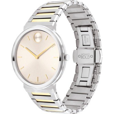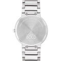 Diese Movado Uhr hat ein Edelstahl Gehäuse mit einem Durchmesser von 40 mm und ist mit einem Armband aus Edelstahl versehen.