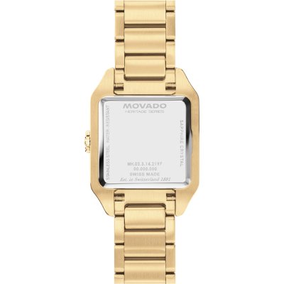 Diese Movado Uhr hat ein Edelstahl Gehäuse mit einem Durchmesser von 25 mm und ist mit einem Armband aus Edelstahl versehen. In der Uhr arbeitet ein Ronda Uhrwerk. Das Glas der Uhr besteht aus Sapphir - Glas.