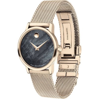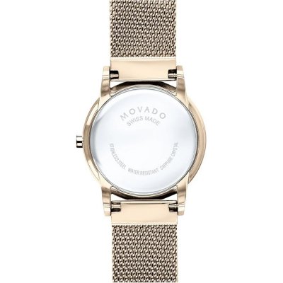 Diese Movado Uhr hat ein Edelstahl Gehäuse mit einem Durchmesser von 28 mm und ist mit einem Armband aus Edelstahl versehen. In der Uhr arbeitet ein ETA Uhrwerk. Das Glas der Uhr besteht aus Sapphir - Glas.