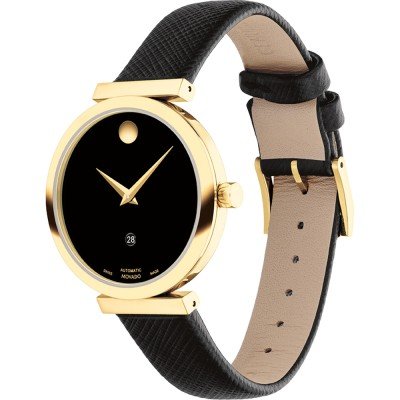 Diese Movado Uhr hat ein Edelstahl Gehäuse mit einem Durchmesser von 32 mm und ist mit einem Armband aus Leder versehen. In der Uhr arbeitet ein Sellita Uhrwerk. Das Glas der Uhr besteht aus Sapphir - Glas.