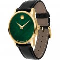 Diese Movado Uhr hat ein Edelstahl Gehäuse mit einem Durchmesser von 28 mm und ist mit einem Armband aus Leder versehen. In der Uhr arbeitet ein ETA Uhrwerk. Das Glas der Uhr besteht aus Sapphir - Glas.