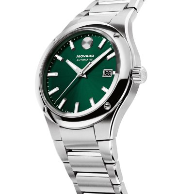 Diese Movado Uhr hat ein Edelstahl Gehäuse mit einem Durchmesser von 40 mm und ist mit einem Armband aus Edelstahl versehen. In der Uhr arbeitet ein Sellita Uhrwerk. Das Glas der Uhr besteht aus Sapphir - Glas.