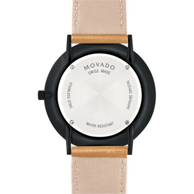 Diese Movado Uhr hat ein Edelstahl Gehäuse mit einem Durchmesser von 40 mm und ist mit einem Armband aus Leder versehen. In der Uhr arbeitet ein Ronda Uhrwerk. Das Glas der Uhr besteht aus Sapphir - Glas.