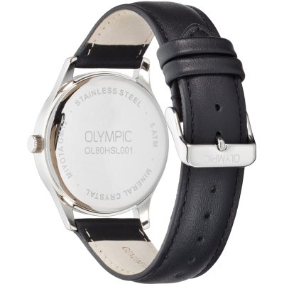 Diese Olympic Uhr hat ein Edelstahl Gehäuse mit einem Durchmesser von 40 mm und ist mit einem Armband aus Leder versehen. In der Uhr arbeitet ein Miyota Uhrwerk. Das Glas der Uhr besteht aus Mineral - Glas.