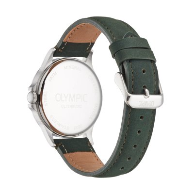 Diese Olympic Uhr hat ein Edelstahl Gehäuse mit einem Durchmesser von 40 mm und ist mit einem Armband aus Leder versehen. In der Uhr arbeitet ein Miyota Uhrwerk. Das Glas der Uhr besteht aus Mineral - Glas.