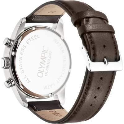 Diese Olympic Uhr hat ein Edelstahl Gehäuse mit einem Durchmesser von 40 mm und ist mit einem Armband aus Leder versehen. In der Uhr arbeitet ein Seiko Instruments Inc. Uhrwerk. Das Glas der Uhr besteht aus Mineral - Glas.
