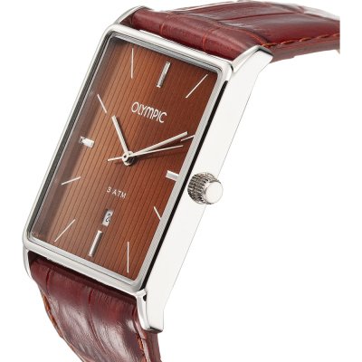 Diese Olympic Uhr hat ein Edelstahl Gehäuse mit einem Durchmesser von 31 mm und ist mit einem Armband aus Leder versehen. In der Uhr arbeitet ein Miyota Uhrwerk. Das Glas der Uhr besteht aus Mineral - Glas.