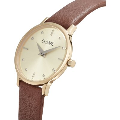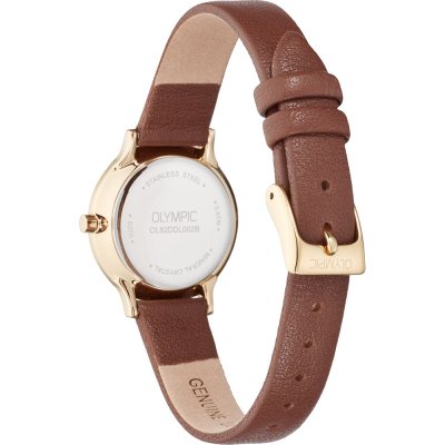 Diese Olympic Uhr hat ein Edelstahl Gehäuse mit einem Durchmesser von 26 mm und ist mit einem Armband aus Leder versehen. In der Uhr arbeitet ein Seiko Instruments Inc. Uhrwerk. Das Glas der Uhr besteht aus Mineral - Glas.