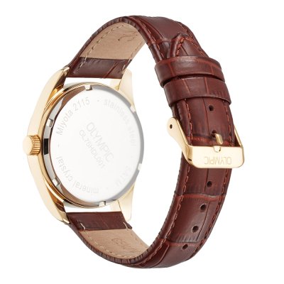 Diese Olympic Uhr hat ein Edelstahl Gehäuse mit einem Durchmesser von 39 mm und ist mit einem Armband aus Leder versehen. In der Uhr arbeitet ein Miyota Uhrwerk. Das Glas der Uhr besteht aus Mineral - Glas.