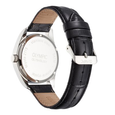 Diese Olympic Uhr hat ein Edelstahl Gehäuse mit einem Durchmesser von 39 mm und ist mit einem Armband aus Leder versehen. In der Uhr arbeitet ein Miyota Uhrwerk. Das Glas der Uhr besteht aus Mineral - Glas.