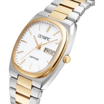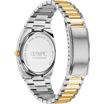 Diese Olympic Uhr hat ein Edelstahl Gehäuse mit einem Durchmesser von 36 mm und ist mit einem Armband aus Edelstahl versehen. In der Uhr arbeitet ein Seiko Instruments Inc. Uhrwerk. Das Glas der Uhr besteht aus Sapphir - Glas.