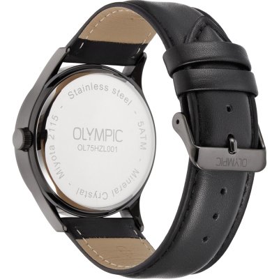 Diese Olympic Uhr hat ein Edelstahl Gehäuse mit einem Durchmesser von 43 mm und ist mit einem Armband aus Leder versehen. In der Uhr arbeitet ein Miyota Uhrwerk. Das Glas der Uhr besteht aus Mineral - Glas.