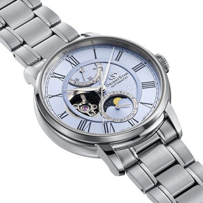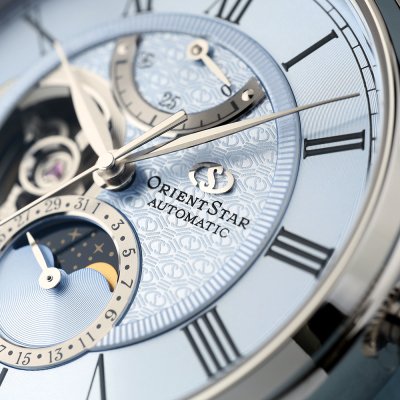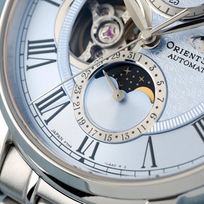 Diese auf 190 Exemplare limitierte Uhr M45 F7 basiert auf dem Design der 2017 erschienenen Mechanical Moon Phase. Die Moon Phase hat sich im Vergleich zum Original deutlich verändert. Der Hintergrund ist nun ein tiefblauer Nachthimmel, der die Sterne klarer und heller erscheinen lässt. Das wunderschön detaillierte Zifferblatt weist ein Muster aus dem Orient Star-Logo auf, das nur je nach Lichteinfall sichtbar ist. Da sich alle wichtigen Funktionen in der Mitte des geschichteten Zifferblatts befinden, sticht der äußere Ring mit den römischen Ziffern besonders hervor. Die beidseitige Entspiegelung des Saphirglases blockiert fast 99 Prozent der Reflexionen und sorgt so für eine gute Sicht aus jedem Blickwinkel.