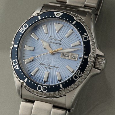 Diese Orient Uhr hat ein Edelstahl Gehäuse mit einem Durchmesser von 41.8 mm und ist mit einem Armband aus Edelstahl versehen. In der Uhr arbeitet ein Orient Uhrwerk. Das Glas der Uhr besteht aus Sapphir - Glas.