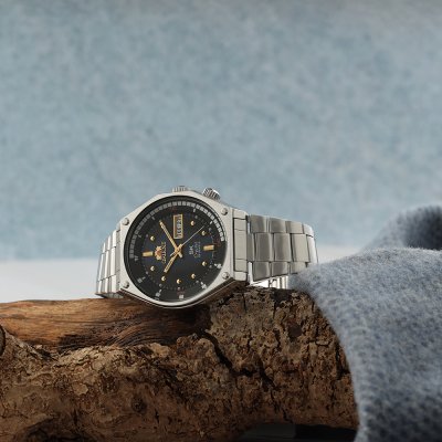 Diese Orient Uhr hat ein Edelstahl Gehäuse mit einem Durchmesser von 41.7 mm und ist mit einem Armband aus Edelstahl versehen. In der Uhr arbeitet ein Orient Uhrwerk. Das Glas der Uhr besteht aus Gehärtetem Mineral - Glas.