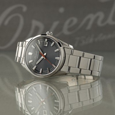 Diese Orient Uhr hat ein Edelstahl Gehäuse mit einem Durchmesser von 38.5 mm und ist mit einem Armband aus Edelstahl versehen. In der Uhr arbeitet ein Orient Uhrwerk. Das Glas der Uhr besteht aus Sapphir - Glas.