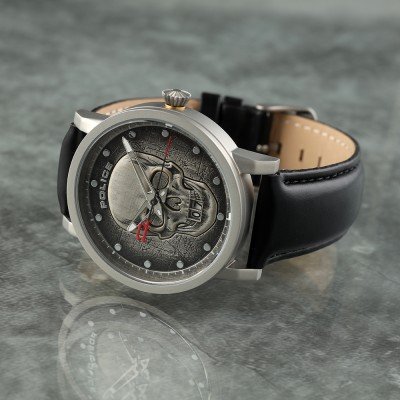 Diese Police Uhr hat ein Edelstahl Gehäuse mit einem Durchmesser von 42.5 mm und ist mit einem Armband aus Leder versehen. In der Uhr arbeitet ein Seiko Instruments Inc. Uhrwerk. Das Glas der Uhr besteht aus Mineral - Glas.