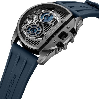 Diese Police Uhr hat ein Edelstahl Gehäuse mit einem Durchmesser von 48 mm und ist mit einem Armband aus Kautschuk versehen. In der Uhr arbeitet ein Seiko Instruments Inc. Uhrwerk. Das Glas der Uhr besteht aus Mineral - Glas.