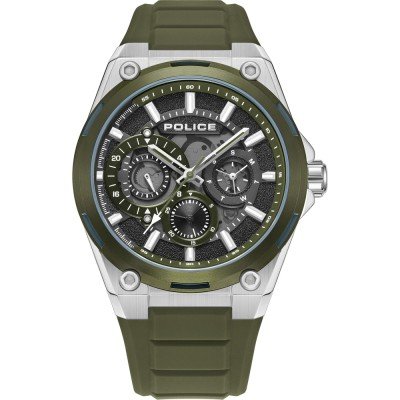 Diese Police Uhr hat ein Edelstahl Gehäuse mit einem Durchmesser von 45 mm und ist mit einem Armband aus Kautschuk versehen. In der Uhr arbeitet ein Miyota Uhrwerk. Das Glas der Uhr besteht aus Mineral - Glas.
