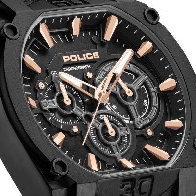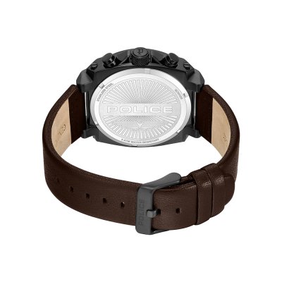 Diese Police Uhr hat ein Edelstahl Gehäuse mit einem Durchmesser von 45 mm und ist mit einem Armband aus Leder versehen. In der Uhr arbeitet ein Seiko Instruments Inc. Uhrwerk. Das Glas der Uhr besteht aus Mineral - Glas.