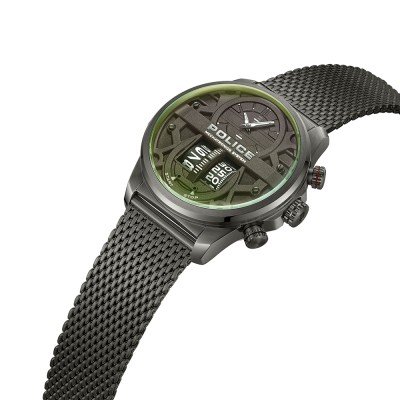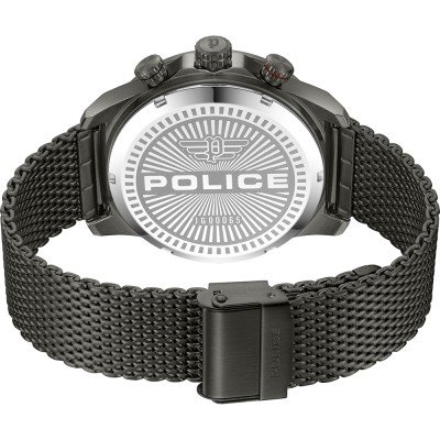 Diese Police Uhr hat ein Edelstahl Gehäuse mit einem Durchmesser von 44 mm und ist mit einem Armband aus Metall versehen. In der Uhr arbeitet ein Bao Jie Uhrwerk. Das Glas der Uhr besteht aus Mineral - Glas.
