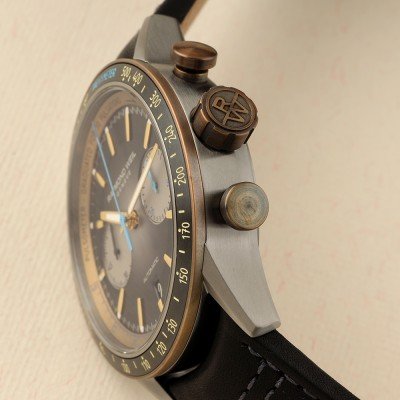 Der Raymond Weil freelancer Chronograph 7780 verfügt über einen 30-Minuten- Chronographen und eine kleine Sekundenanzeige in einem symmetrischen Bi-Compax-Layout. Das gesamte Erscheinungsbild der Uhr ist äußerst ausgewogen und detailliert. Das Zifferblatt spielt auf wunderbare Weise mit Schattierungen, Tiefen und Texturen und trägt so zum Gesamtbild der Uhr bei. Ein bemerkenswertes Detail ist beispielsweise die schwarze Datumsanzeige bei 6 Uhr, ein von Uhrenliebhabern sehr geschätztes Detail. Die Farbgebung strahlt unaufdringliche Klasse aus; die Tachymeterskala befindet sich auf einem goldfarbenen Ring. Die goldfarbenen Zeiger und Indizes sind aufgrund ihrer Proportionen gut ablesbar. Die Farbe des zentralen Sekundenzeigers des Chronographen, der Zeiger des 30-Minuten-Registers und die Ziffern der Pulsometerskala sind alle in Blautönen gehalten. Das Automatikwerk Kaliber RW5030 ist durch den Gehäuseboden sichtbar und beweist nicht nur im Aussehen, sondern auch in der Funktionalität Liebe zum Detail. Die Uhr ist mit einer skelettierten Schwungmasse in W-Form ausgestattet, eine Anspielung auf den Nachnamen des Gründers. Ein weiteres Merkmal dieses Automatikwerks ist, dass die Uhr bei vollständig aufgezogener Aufzugsfeder bis zu 62 Stunden autonom läuft.