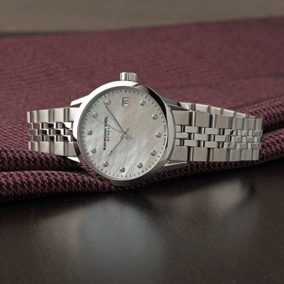 Diese Raymond Weil Uhr hat ein Edelstahl Gehäuse mit einem Durchmesser von 34 mm und ist mit einem Armband aus Edelstahl versehen. In der Uhr arbeitet ein ETA Uhrwerk. Das Glas der Uhr besteht aus Sapphir - Glas.