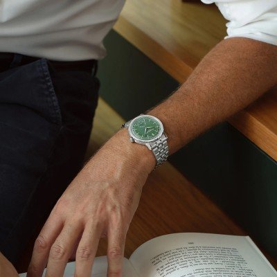 Die Raymond Weil Millesime Kollektion ist inspiriert von der Eleganz der Uhren aus der Mitte des Jahrhunderts, die in einem modernen Kontext neu interpretiert wurden. Raymond Weil macht es sich nicht leicht und kopiert frühere Designs nicht, sondern interpretiert den Vintage-Charme neu. Das Ergebnis ist eine Uhr, die sowohl zeitlos als auch aktuell wirkt. Die Millesima wird Liebhabern des Vintage-Stils und Liebhabern der Haute Horlogerie gleichermaßen gefallen. Das "Sektorzifferblatt" weist kontrastierende Oberflächen auf: die Stundenlinie ist glatt, die Minutenlinie ist geschlängelt und der zentrale Bereich des Zifferblatts weist eine feine vertikale Bürstenstruktur auf. Drei verschiedene konzentrische Spuren, die von den Sekunden (180 Markierungen) über die Minuten (60 Markierungen) bis hin zu den Stunden (12 Markierungen) reichen, ermöglichen ein präzises Ablesen der Zeit, wobei die kleine Sekunde bei 6 Uhr in einem versenkten Kreis angeordnet ist. Das Zifferblatt ist in einem Edelstahlgehäuse mit entspiegeltem Saphirglas untergebracht. Die Lünette ist mit einer vertikalen, satinierten Bürste verziert, die sich von der hochglanzpolierten Fase abhebt. Angetrieben von einem Automatikwerk RW4251 (basierend auf dem SW260) mit einem speziell angefertigten W-förmigen Rotor und 31 Steinen, das mit 28.800 Umdrehungen pro Stunde läuft und eine Gangreserve von 41 Stunden bietet, vereint die Millesime Retro-Charme, ein modernes Uhrwerk und Liebe zum Detail, die alle zu einer hervorragenden Gesamtqualität beitragen.