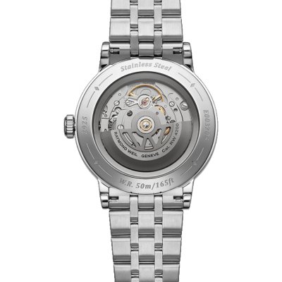 Diese Raymond Weil Uhr hat ein Edelstahl Gehäuse mit einem Durchmesser von 39 mm und ist mit einem Armband aus Edelstahl versehen. In der Uhr arbeitet ein Sellita Uhrwerk. Das Glas der Uhr besteht aus Sapphir - Glas.