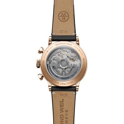 Das Herzstück des Millesime Tri-Compax Chronographen ist ein RW5030 (basierend auf dem SW510), ein Chronographenwerk mit Automatikaufzug und speziell angefertigtem W-förmigem Rotor. Es ist durch den Ausstellungsboden sichtbar, hat 25 Steine, schlägt mit 28.800 Umdrehungen pro Stunde und verfügt über eine Gangreserve von 62 Stunden, was Genauigkeit und Zuverlässigkeit garantiert. Die Uhr ist Teil der großen Millesime-Familie, die das Design der Jahrhundertmitte mit moderner Eleganz verbindet. Das Retro-Sektorzifferblatt ist mit einer geschlängelten Minuterie versehen, und der zentrale Bereich des Zifferblatts ist mit einer zarten vertikalen Bürste verziert. Zeiger und Indexe sind mit SuperLuminova beschichtet, um die Ablesbarkeit bei schlechten Lichtverhältnissen zu gewährleisten. Eine Tachymeterskala umgibt das Zifferblatt und verleiht ihm eine funktionale und sportlich-dynamische Note. Das 39-mm-Edelstahlgehäuse besteht aus einer Kombination von glatten und gebürsteten Oberflächen, die Retro-Charme, ein modernes Uhrwerk und die Liebe zum Detail miteinander verbinden und so zu einer hervorragenden Gesamtqualität beitragen. Mit der Millesime Tri-Compax hat Raymond Weil einen Zeitmesser geschaffen, der den Charme der Vergangenheit mit der Funktionalität der Gegenwart verbindet.
