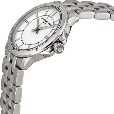 Diese Raymond Weil Uhr hat ein Edelstahl Gehäuse mit einem Durchmesser von 39 mm und ist mit einem Armband aus Edelstahl versehen. In der Uhr arbeitet ein ETA Uhrwerk. Das Glas der Uhr besteht aus Sapphir - Glas.