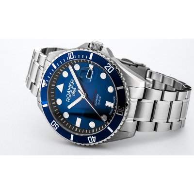 Diese Roamer Uhr hat ein Edelstahl Gehäuse mit einem Durchmesser von 43 mm und ist mit einem Armband aus Edelstahl versehen. In der Uhr arbeitet ein Ronda Uhrwerk. Das Glas der Uhr besteht aus Sapphir - Glas.