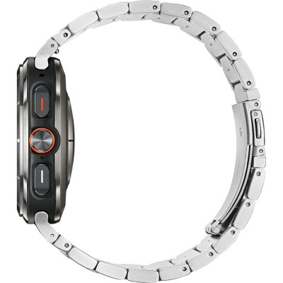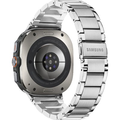 Diese Samsung Uhr hat ein Titan Gehäuse mit einem Durchmesser von 47 mm und ist mit einem Armband aus Edelstahl versehen.
