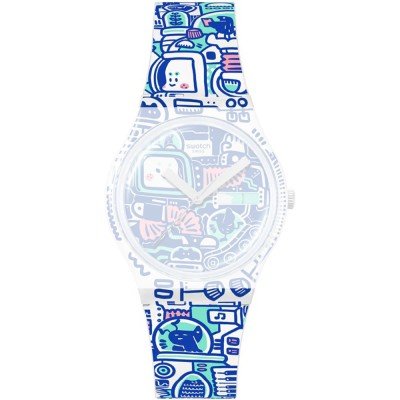 Dieses Swatch Uhrarmband ist aus silikon gefertigt und wird mit stahlstifte an der Uhr befestigt. Das Band hat eine Breite von 17 mm und wird mit einer dornschließe geschlossen. Das Uhrenarmband hat keine gerade Halterung, was bedeutet, dass dieses Band nur für die unten aufgeführten Uhren geeignet ist.