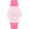 Dieses Swatch Uhrarmband ist aus silikon gefertigt und wird mit stahlstifte an der Uhr befestigt. Das Band hat eine Breite von 17 mm und wird mit einer dornschließe geschlossen. Das Uhrenarmband hat keine gerade Halterung, was bedeutet, dass dieses Band nur für die unten aufgeführten Uhren geeignet ist.