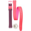 Dieses Swatch Uhrarmband ist aus silikon gefertigt und wird mit stahlstifte an der Uhr befestigt. Das Band hat eine Breite von 12 mm und wird mit einer dornschließe geschlossen. Das Uhrenarmband hat keine gerade Halterung, was bedeutet, dass dieses Band nur für die unten aufgeführten Uhren geeignet ist.