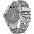 Diese Swatch Uhr hat ein Edelstahl Gehäuse mit einem Durchmesser von 42 mm und ist mit einem Armband aus Edelstahl versehen. In der Uhr arbeitet ein ETA Uhrwerk. Das Glas der Uhr besteht aus Mineral - Glas.