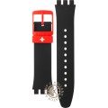 Dieses Swatch Uhrarmband ist aus silikon gefertigt und wird mit stahlstifte an der Uhr befestigt. Das Band hat eine Breite von 19.8 mm und wird mit einer dornschließe geschlossen. Das Uhrenarmband hat keine gerade Halterung, was bedeutet, dass dieses Band nur für die unten aufgeführten Uhren geeignet ist.