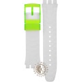 Dieses Swatch Uhrarmband ist aus silikon gefertigt und wird mit stahlstifte an der Uhr befestigt. Das Band hat eine Breite von 21.3 mm und wird mit einer dornschließe geschlossen. Das Uhrenarmband hat keine gerade Halterung, was bedeutet, dass dieses Band nur für die unten aufgeführten Uhren geeignet ist.