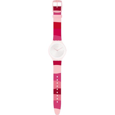 Dieses Swatch Uhrarmband ist aus silikon gefertigt und wird mit stahlstifte an der Uhr befestigt. Das Band hat eine Breite von 14.6 mm und wird mit einer dornschließe geschlossen. Das Uhrenarmband hat keine gerade Halterung, was bedeutet, dass dieses Band nur für die unten aufgeführten Uhren geeignet ist.