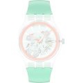 Dieses Swatch Uhrarmband ist aus silikon/Kautschuk gefertigt und wird mit stahlstifte an der Uhr befestigt. Das Band hat eine Breite von 19.7 mm und wird mit einer dornschließe geschlossen. Das Uhrenarmband hat keine gerade Halterung, was bedeutet, dass dieses Band nur für die unten aufgeführten Uhren geeignet ist.
