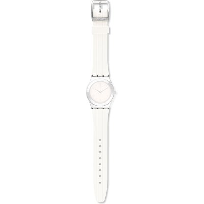 Dieses Swatch Uhrarmband ist aus silikon gefertigt und wird mit stahlstifte an der Uhr befestigt. Das Band hat eine Breite von 17 mm und wird mit einer dornschließe geschlossen. Das Uhrenarmband hat keine gerade Halterung, was bedeutet, dass dieses Band nur für die unten aufgeführten Uhren geeignet ist.