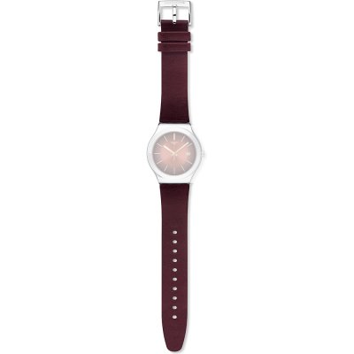 Dieses Swatch Uhrarmband ist aus leder gefertigt und wird mit stahlstifte an der Uhr befestigt. Das Band hat eine Breite von 18.9 mm und wird mit einer dornschließe geschlossen. Das Uhrenarmband hat keine gerade Halterung, was bedeutet, dass dieses Band nur für die unten aufgeführten Uhren geeignet ist.