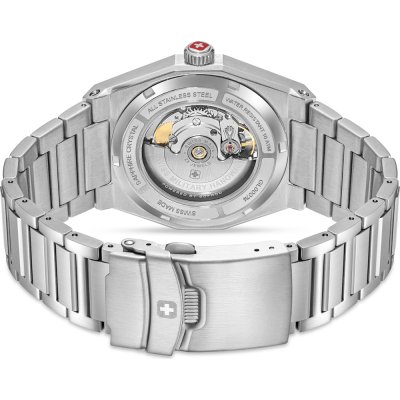 Diese Swiss Military Hanowa Uhr hat ein Edelstahl Gehäuse mit einem Durchmesser von 41 mm und ist mit einem Armband aus Edelstahl versehen. In der Uhr arbeitet ein Soprod Uhrwerk. Das Glas der Uhr besteht aus Sapphir - Glas.