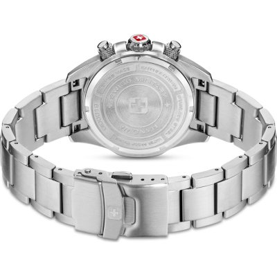 Diese Swiss Military Hanowa Uhr hat ein Edelstahl Gehäuse mit einem Durchmesser von 44 mm und ist mit einem Armband aus Edelstahl versehen. In der Uhr arbeitet ein Timex Uhrwerk. Das Glas der Uhr besteht aus Sapphir - Glas.